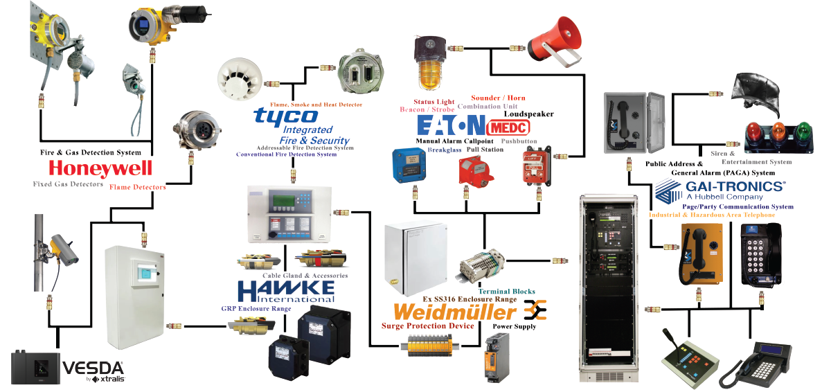 SOLUTION WE PROVIDE SERVICE MAINTENANCE ENGINEERING, INSTALLING AND COMMISIONING IN-HOUSE TRAINING FACILITIES OUR PRODUCT & SERVICE CAPABILITY Siren System Public Address And General Alarm (PAGA) System Entertainment System Hazardous, Industrial , IP Telephones Acoustic Hoods Intercom Talkback & Paging Hazardous Area Field Electrical Equipment Manual Alarm Call Points Sound And Loudspeaker Status Light / Lamps And Beacons / Strobes Controls And Distributions Fixed And Portable Gas Detectors Fire And Gas Detection Systems Conventional Fire Detection Systems Addressable Fire Detection Systems Flame, Smoke And Heat Detectors Electrical Products For Harsh And Hazardous Locations Zone 1 & 2 Fluorescent Luminaires Emergency Luminaires , Ex-proof Types Floodlight , Industrial And Flameproof Cable Glands And Accessories Exe, Exd Junction Boxes And Enclosures Exd Connectors Maintenance of PAGA Systems Fire Alarm Panel Preventive & Corrective Maintenance